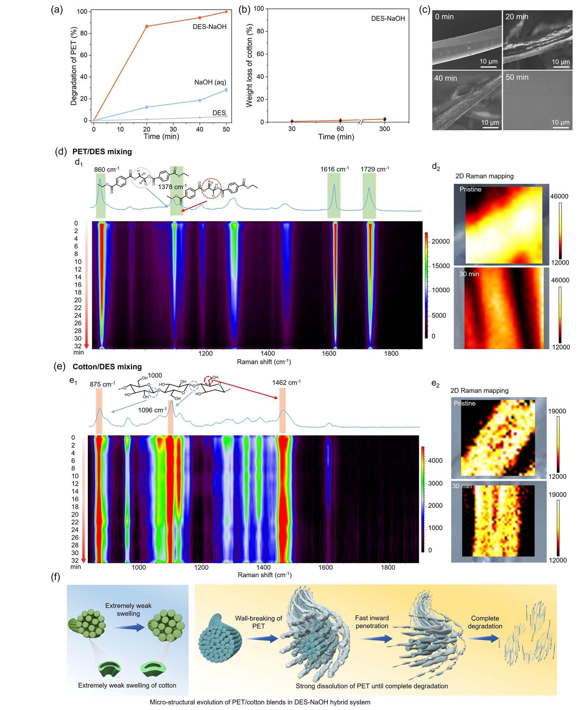 本研究创新性地构建了由氯化胆碱(ChCl)/乙二醇(EG)低共熔溶剂(DES)与NaOH 构成的协同解聚体系(DES-NaOH),成功实现了废旧涤棉混纺织物的高效分离与资源化回收。在系统优化分离温度、反应时间、碱用量及浴比等关键参数后,在温和条件(98℃、60 min、5% w/v NaOH、浴比1:30)下实现了涤纶组分的完全解聚与棉纤维结构的有效保留。在该过程中,涤纶纤维解聚率达到100%,所得解聚产物对苯二甲酸(TPA)纯度高达99.85%,而棉纤维质量损失控制在3%以内,其结构与性能得到完整维持。为进一步探明该过程的选择性机制,采用原位拉曼等技术,揭示了DES对涤纶结构的选择性“疏松”作用,据此提出“破壁-快渗透”降解机制,从机理层面阐释了涤纶解聚的专一性行为。在此基础上,开发了“降解-酸沉-蒸发-补碱” 循环工艺流程,验证了DES-NaOH体系在连续分离过程中的良好稳定性与循环潜力。公斤级放大实验证实,该体系在规模化条件下仍保持优异的降解效率,为其工业转化提供了关键依据。本方法兼具低碳排放、低能耗与高效率的综合优势,不仅为涤棉混纺织物的绿色分离与高值转化提供了新技术路径,也为纺织废弃物的循环再生提供了坚实的理论支撑与实践基础。
