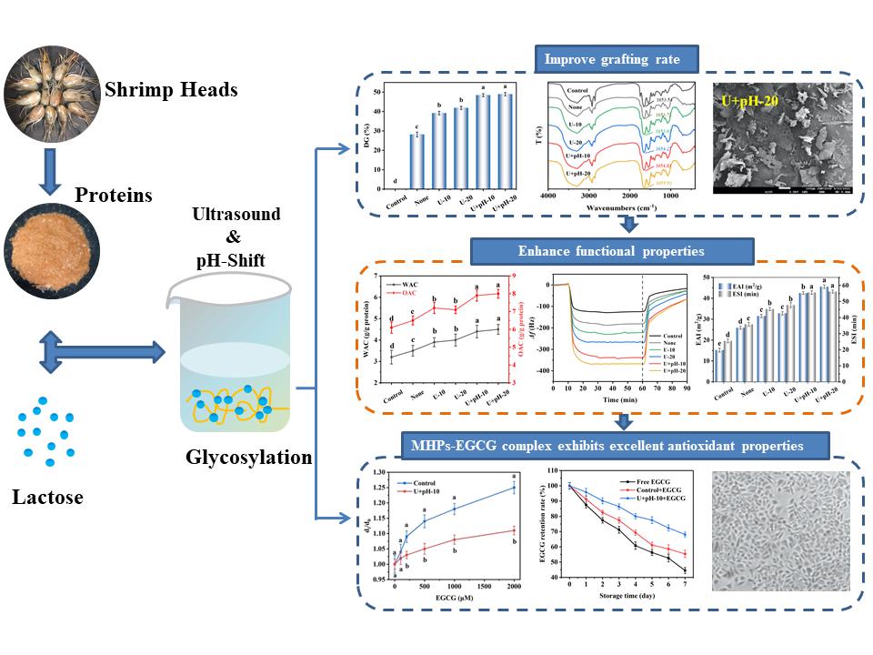 近日,生物与食品工程学院王顺民教授研究团队在水产品副产物高值化利用领域取得重要突破。在食品领域著名期刊《Food Chemistry: X》(中科院1区Top,影响因子8.2)发表题为“Effects of ultrasound combined with pH-shift assisted glycosylation modification on the structural and functional properties of by-product proteins extracted from shrimp heads”的最新研究成果。我校为第一署名单位,李玉锋博士为论文第一作者。
