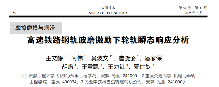 近日,机械与汽车工程学院吴波文副教授研究团队在《表面技术》上发表题为“高速铁路钢轨波磨激励下轮轨瞬态响应分析”的最新研究成果。我校为第一署名单位,硕士研究生王静文为第一作者,吴波文副教授为论文通信作者。该期刊为EI、CSCD 核心库等多数据库收录期刊,入选材料-综合、金属材料、有色金属等领域高质量科技期刊T2级,以及机械工程领域T3级期刊。