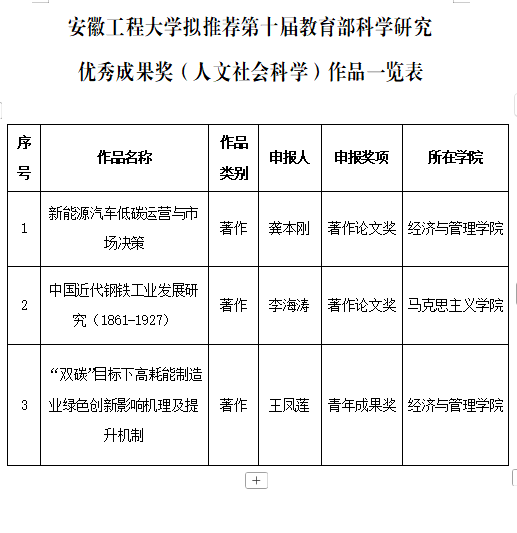 根据第十届教育部科学研究优秀成果奖(人文社会科学)申报工作安排,经个人申报、单位审查及专家评审,并按照省教育厅下达的申报指标,我校拟推荐3项成果参与评选。现将推荐名单予以公示。