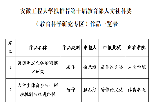 经教师个人申报、单位审查、专家评审评议,并依据本专区限项2项的申报指标,现对我校拟推荐参加第十届教育部人文社科奖(教育科学研究专区)评选的2项成果予以公示。