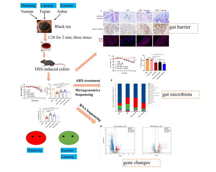 红茶常用于茶饮生产,并已被证实是一种有效的天然成分,可预防实验性结肠炎。然而,目前尚缺乏证据表明不同产地的红茶在结肠炎小鼠模型中是否具有相似的抗炎能力。本研究中,小鼠在接受4%葡聚糖硫酸钠诱导结肠炎前一周,每日分别服用正山小种、祁门红茶或滇红红茶提取物。结果表明,正山小种和祁门红茶提取物的抗炎效果均优于滇红红茶提取物。前两种茶提取物能够增强肠道屏障功能,并降低结肠和血清中的促炎细胞因子水平。我们推测,没食子儿茶素可能是红茶抗结肠炎作用的关键成分,其可能通过与其他成分以最佳比例的协同作用来增强抗炎功效。粪便 16S rRNA 测序表明,正山小种和祁门红茶提取物对肠道微生物组具有不同的调节作用,且该抗结肠炎作用依赖于肠道微生物。结肠转录组分析表明,正山小种和祁门红茶提取物分别通过调节IL-17通路和谷氨酸能突触的基因表达,对结肠炎产生不同的影响。总的来说,本研究为理解不同红茶在结肠炎中的差异化作用机制提供了新的证据,也为从营养干预角度探索结肠炎的预防和调控提供了方向。