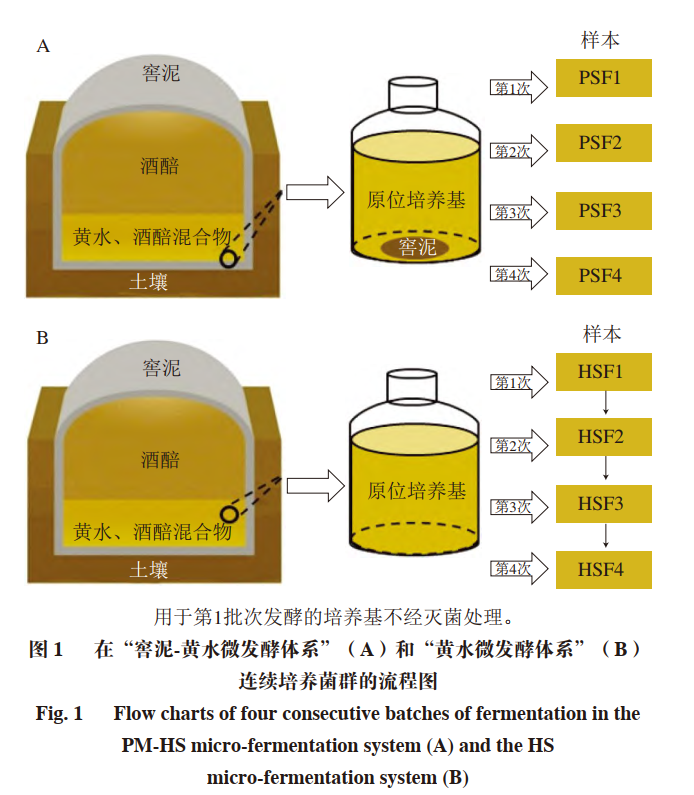 中国浓香型白酒发酵是在传统泥窖中由混合菌群进行的固态分批发酵。浓香型白酒发酵体系是一个典型的己酸合成代谢体系。窖泥是己酸生成菌(以下简称“己酸菌”)等厌氧菌的持续释放源,在每个批次的发酵后期与酒醅发酵沉积形成的黄水混合形成“窖泥-黄水微发酵体系”进行代谢。发酵结束后,溶解于乙醇-水混合物中各种微生物的代谢产物与乙醇一起经过蒸馏形成浓香型白酒的风味成分。目前的研究表明,与“窖泥-黄水微发酵体系”共存的窖池底部酒醅蒸馏得到的白酒品质最好。其中的己酸和己酸乙酯含量相对较高。增加己酸降低乳酸,通过酸醇酯化增加己酸乙酯的含量并同时降低乳酸乙酯的含量,即“增己降乳”有利于提高浓香型白酒的发酵品质。