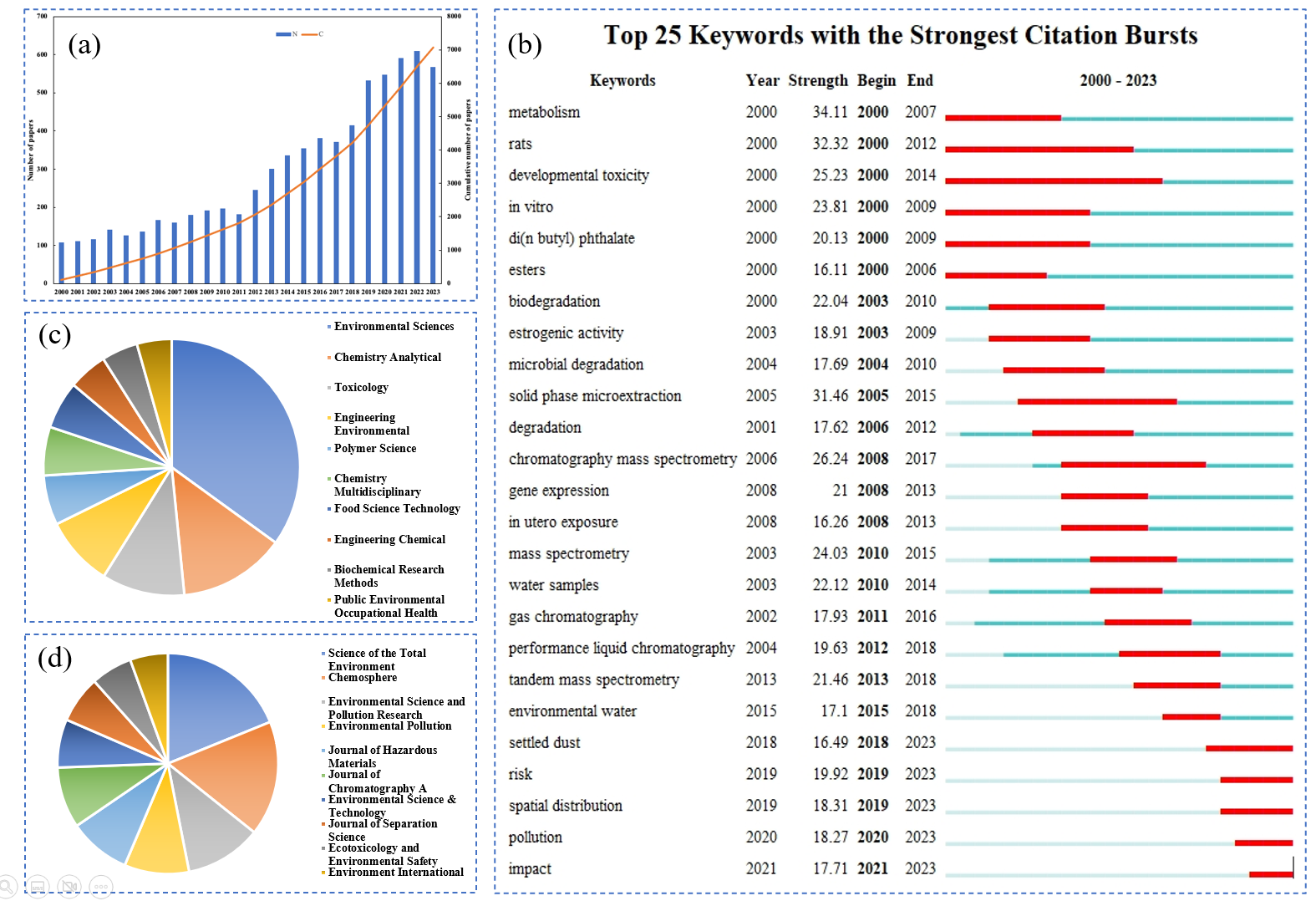 2000-2023年论文、研究领域和出版物期刊发展趋势。年度和累积论文数量(a),突发关键词分析(b),十大最热的研究领域(按Web of Science分类)(c)和十大发表最多的期刊(d)
