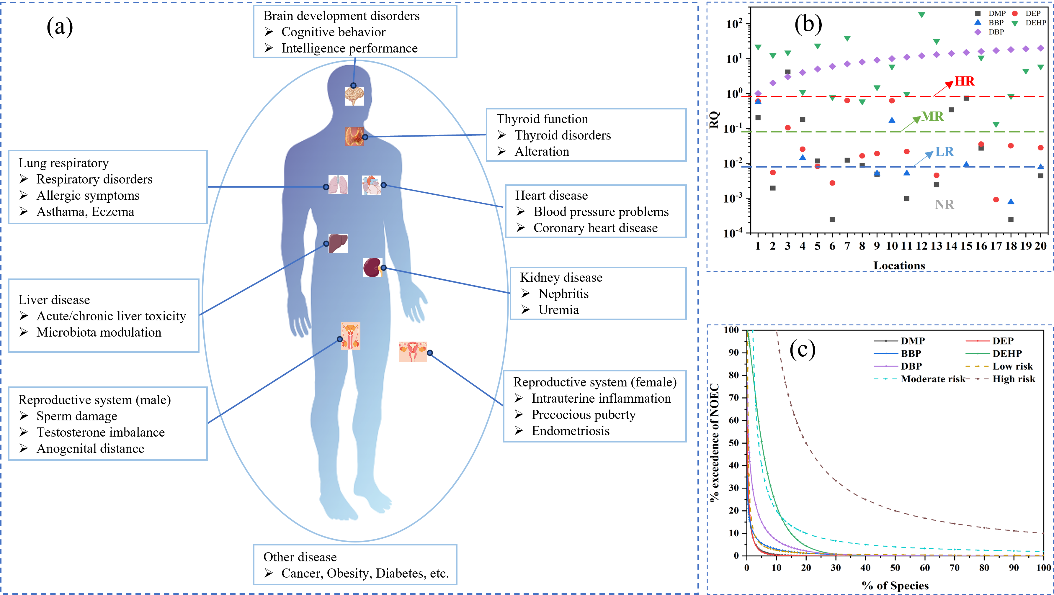 PAEs对人体的危害(a),5种PAEs在淡水环境中的生态风险评估(基于风险商(RQ)法(b)和联合概率曲线(JPCs)法(c))
