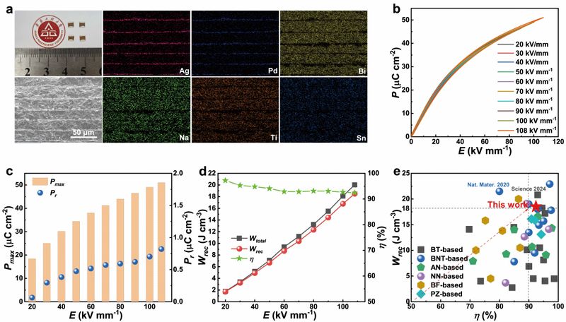 近日发表于《Nature Communications》的研究通过相场模拟指导,设计出(Bi0.2Na0.2Ba0.2Sr0.2Ca0.2)(Ti1-xSnx)O3无铅高熵驰豫铁电体,并提出一种“非极性纳米团簇约束工程”策略以优化其储能特性。引入低离子极化率的Sn4+促使形成局域非铁电钙钛矿单胞,这些单胞构成坚固的非极性纳米团簇,并在高熵构型固有的强局域随机场作用下进一步稳定。这些团簇可作为有效钉扎中心,抑制电场下极性纳米微区的合并与生长,从而缓解极化增强与滞后减小之间的矛盾。基于最优组分(x=0.06)制备的多层陶瓷电容器(MLCC)原型器件展现出~18.5 J·cm-3的高储能密度以及约92.4%的高储能效率,在无铅储能陶瓷材料中呈现出具有竞争力的性能组合,为未来高储能电介质材料的开放提供了理论和实践指导。