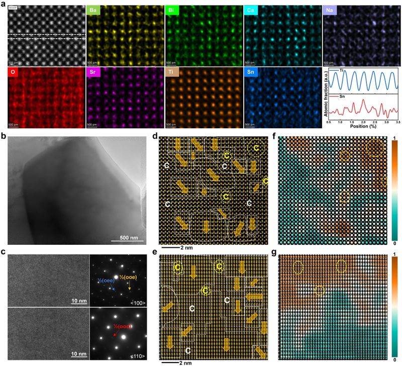 图1 (Bi0.2Na0.2Ba0.2Sr0.2Ca0.2)(Ti0.94Sn0.06)O3陶瓷多级电畴结构表征